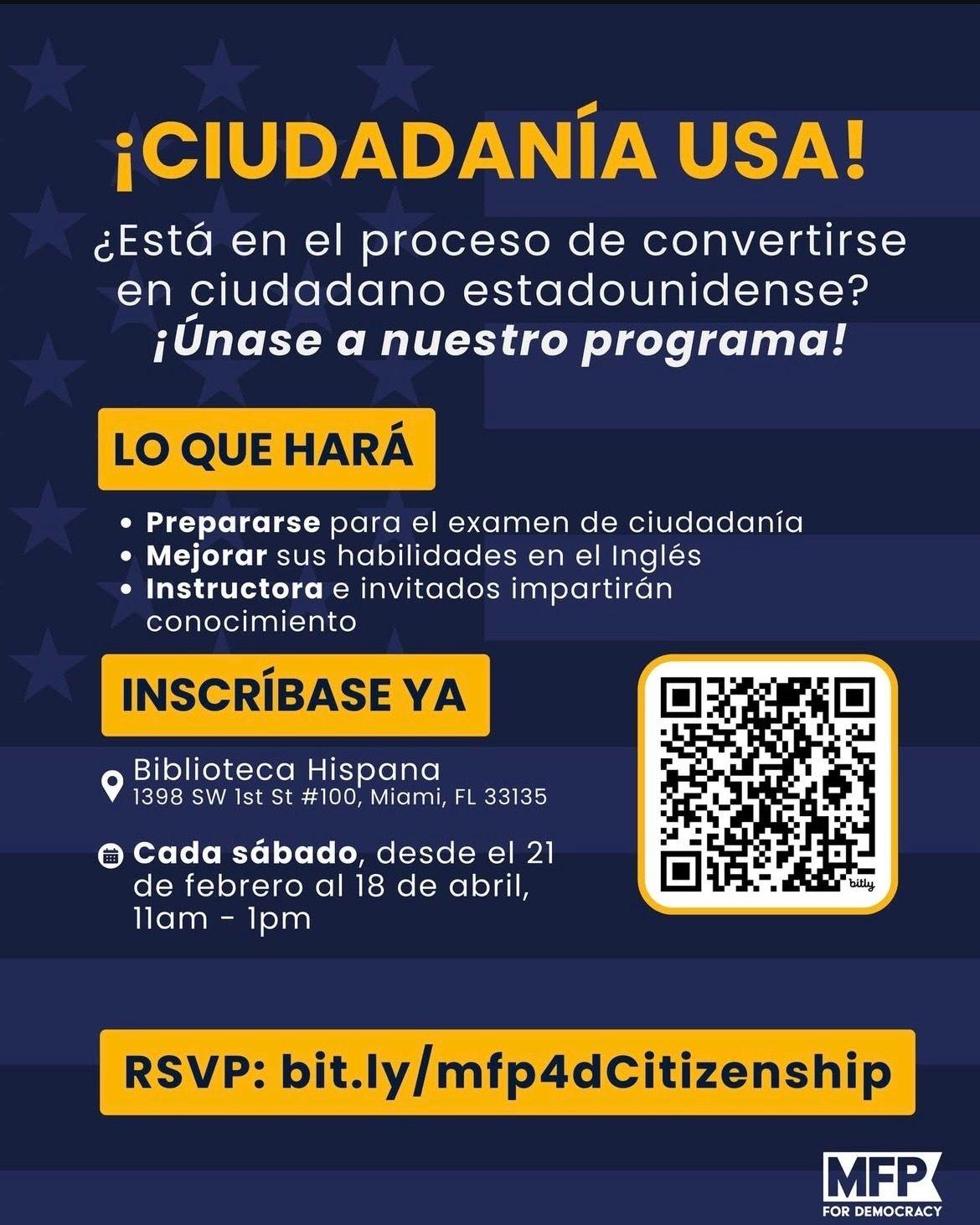 Una instructora especializada impartirá las clases; también acompañará a los estudiantes en el estudio del examen, la comprensión del proceso y el fortalecimiento de la confianza para afrontar la cita migratoria. Además de la preparación académica, el programa incorpora un componente comunitario: representantes invitados de distintas organizaciones locales ofrecerán información sobre recursos disponibles en Miami.