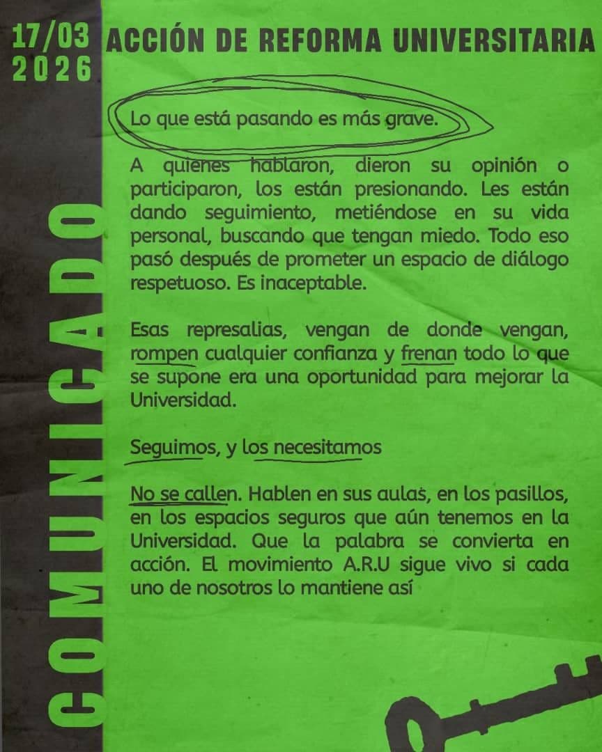 En el canal de WhatsApp Acción de Reforma Universitaria, con más de 2 500 seguidores, la articulación del estudiantado continúa, desde tips para apoyar la reforma hasta principios y prioridades que deben acompañar el cambio. En una comunicación del 17 de marzo, los organizadores denunciaron que «lo que está pasando es grave» porque las autoridades, después de prometer un espacio de diálogo respetuoso, han comenzado a ejercer presión e intimidar a quienes han dado su opinión. «Esas represalias, vengan de donde vengan, rompen cualquier confianza y frenan lo que se supone que era una oportunidad para mejorar la Universidad», denuncian e instan a los universitarios a no callarse y aprovechar los espacios seguros que aún les quedan.