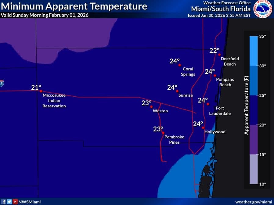 En Broward, particularmente en ciudades como Pembroke Pines y Miramar, donde reside una alta concentración de cubanos, el panorama es similar. Las zonas interiores podrían registrar una sensación térmica de 23–28 °F (-5 a -2 °C), mientras que en localidades costeras como Hollywood o Fort Lauderdale se esperan valores entre 28 y 32 °F (-2 a 0 °C).