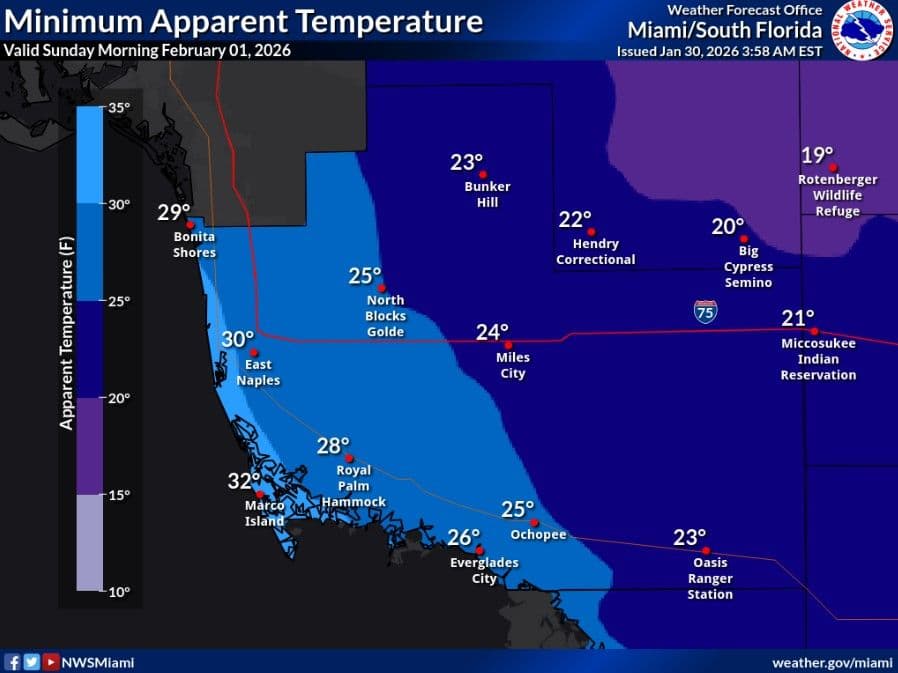 En el condado Miami-Dade, en ciudades como Miami, Hialeah, Kendall y Homestead, la sensación térmica en las zonas interiores podría descender hasta 24–28 °F (entre -4 y -2 °C). En áreas más cercanas a la costa, el frío será menos intenso, pero aun así notable, con valores entre 28 y 34 °F (de -2 a 1 °C).