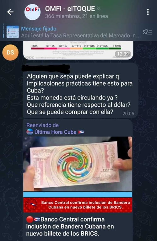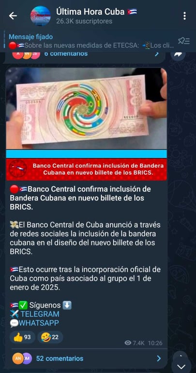 La publicación del Banco Central de Cuba distorsiona la realidad, pues omite información relevante del contexto en que fue presentado el billete con la bandera cubana. Al tratarse de una institución bancaria oficial, ha sido tomada como confirmación de la próxima puesta en circulación de la supuesta moneda de los Brics, como evidencian dudas compartidas con elTOQUE por usuarios de Telegram y contenidos que circulan en canales de esa red social.