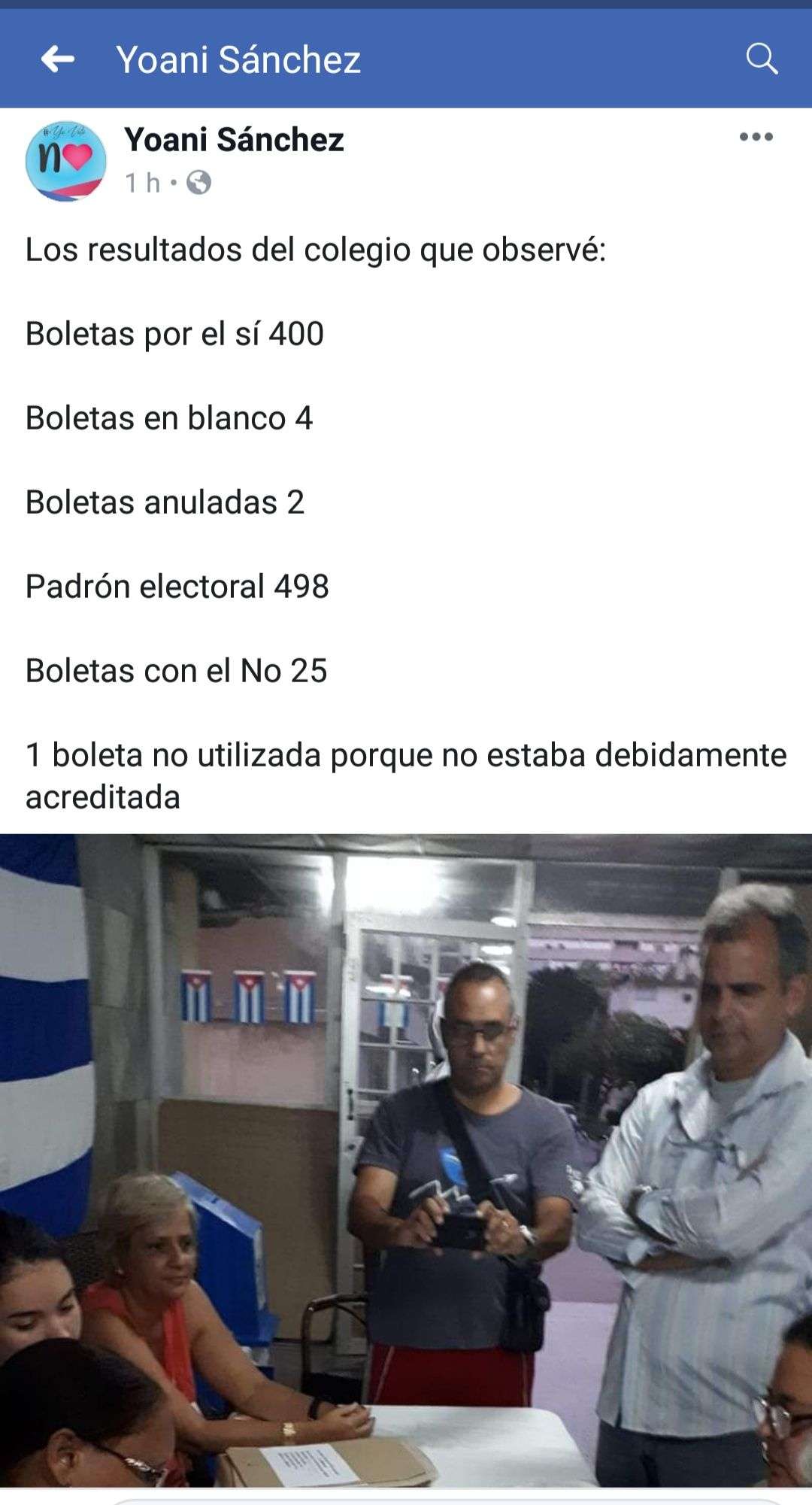 Puedes seguir el Hilo que hemos publicado en Twitter y donde se siguen sumando reportes ciudadanos desde distintas partes del país, como el del lector Yasmani Cabrera, quien desde Holguín, nos envió su reporte a través de nuestra APK: Colegio 5, Hilda Torres, padrón de 361, participaron 335 electores. Sí: 256, No: 50, Blanco: 16, Anuladas: 11.
