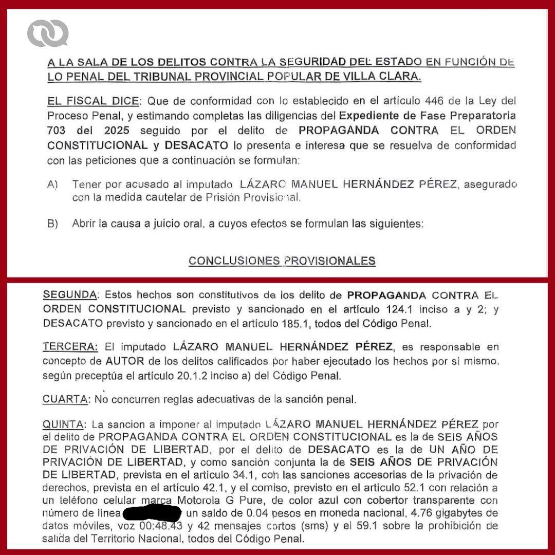 Fragmento de las conclusiones provisionales de la Fiscalía de Villa Clara en el caso contra Lázaro Manuel Hernández, compartido con elTOQUE por Ernesto Cañellas.