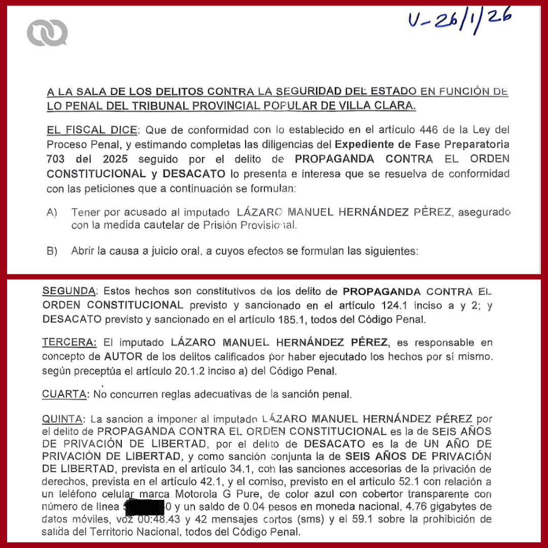 Fragmento de las conclusiones provisionales de la Fiscalía de Villa Clara en el caso contra Lázaro Manuel Hernández.