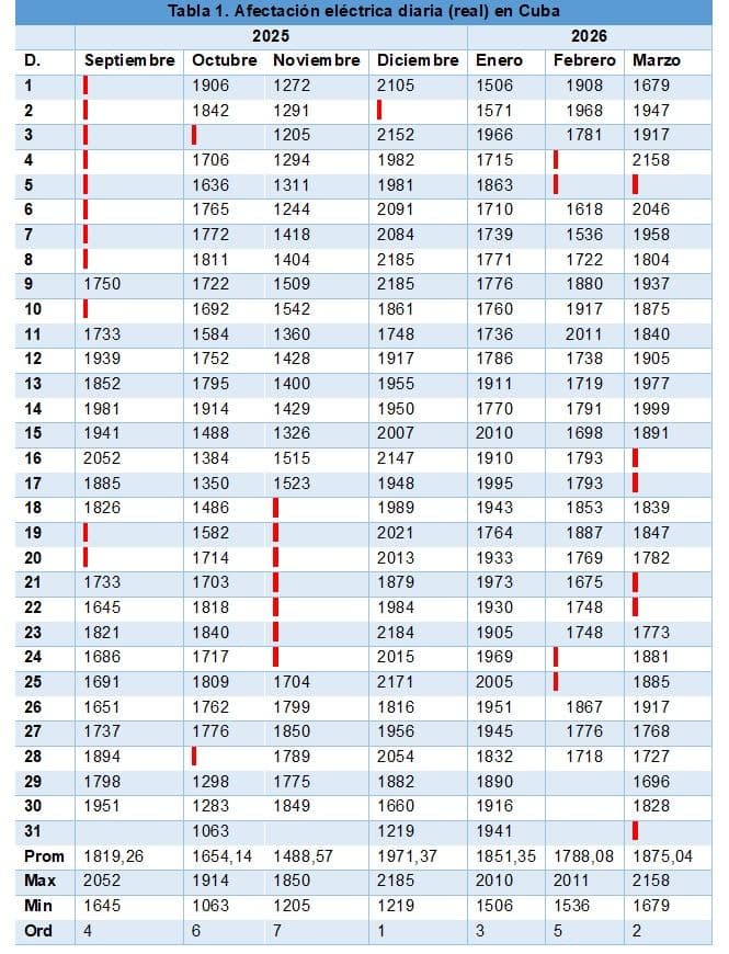Según las estadísticas de la Unión Nacional Eléctrica analizadas por un equipo de elTOQUE, desde septiembre de 2025 a marzo de 2026 el pico crítico de afectaciones eléctricas no se ubica en enero de 2026, sino en diciembre de 2025; mes que no solo tiene el mayor promedio de afectaciones (Tabla 1), sino nueve de los diez registros más altos del período estudiado (Tabla 2).