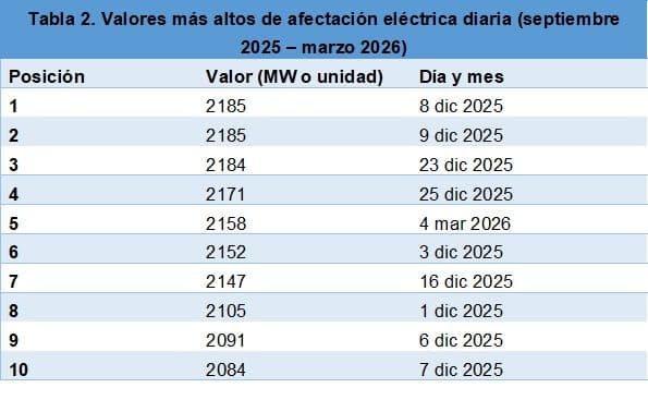 Tabla 2. Valores más altos de afectación eléctrica diaria (septiembre 2025 – marzo 2026).