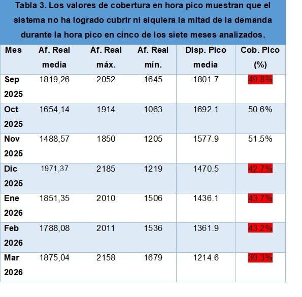 A continuación de diciembre se ubican marzo, enero (2026) y septiembre (2025), mientras febrero (2026), octubre y noviembre (2025) se mantienen en la parte baja de una lista en la que, en dos de los siete meses registrados, la disponibilidad de energía eléctrica apenas cubrió la mitad de la demanda y se quedó por debajo en los otros cinco (Tabla 3).