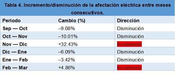 Tabla 4. Incremento-disminución de la afectación eléctrica entre meses consecutivos.