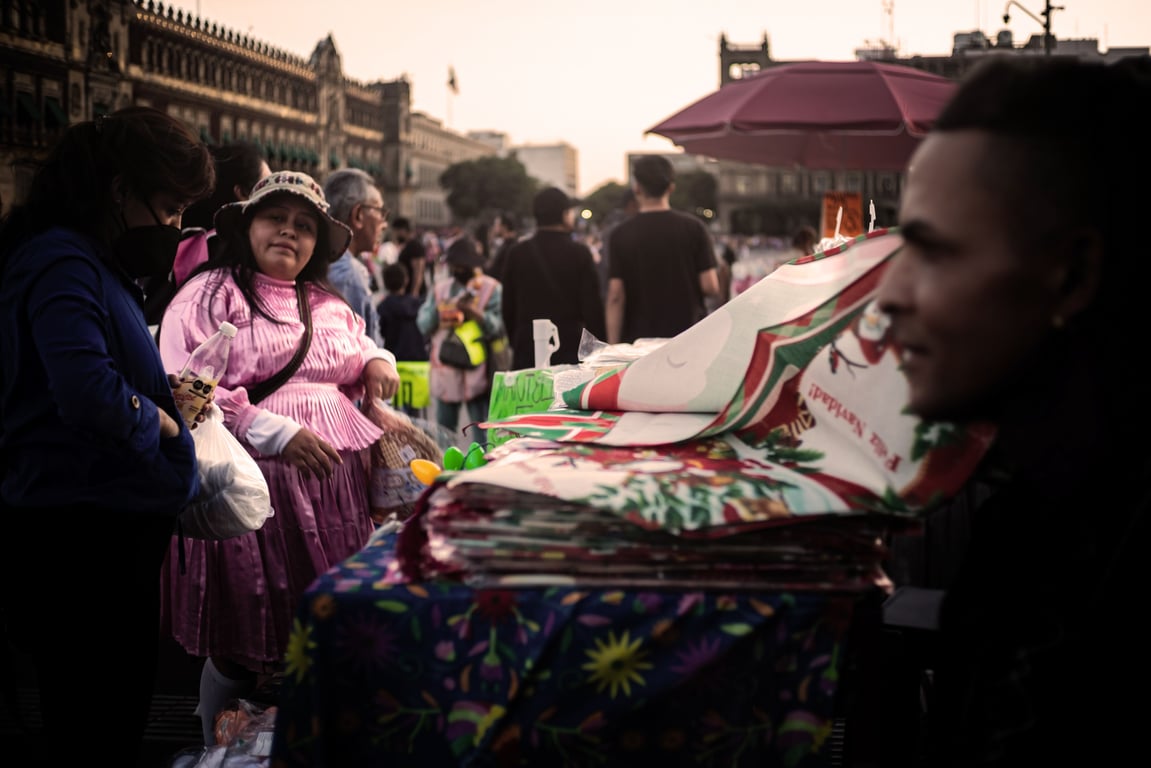 The Zocalo, in the heart of the historic center of Mexico City, is 46,000 square meters of pure anarchy. Bordered by the walls of the Cathedral, the National Palace, the Government Building and other structures a bit more modern, this plaza brings together thousands and thousands of passers-by and hundreds of vendors offering the products of so-called “Magic Mexico.” The calacas [ornate skulls] and ajebrijes [mythic dogs] representing the Day of the Dead, join with printed fabrics, and even paraphernalia allusive to Mexico’s new female president Claudia Sheinbaum, to form a brilliant rainbow of souvenirs whose offering price goes down as you move away from the tables.