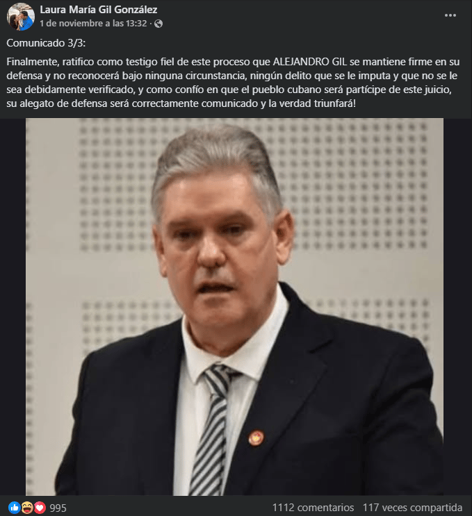 Sin embargo, la hermana del exministro, la expresentadora de la televisión cubana María Victoria Gil, dijo a Martí Noticias que la Fiscalía solicitaría la pena de 30 años para Alejandro Gil.