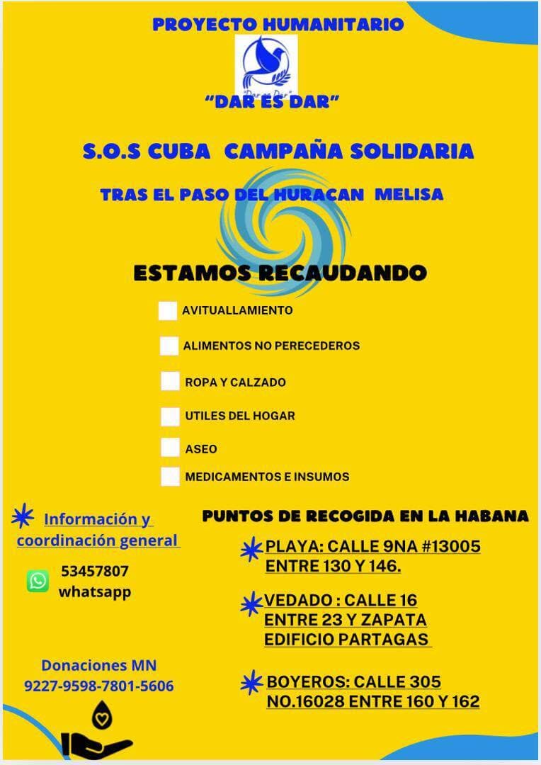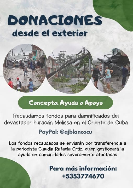 El paso del huracán Melissa dejó severos daños en varias comunidades del oriente de Cuba. La solidaridad de cubanos de dentro y fuera del país es crucial para apoyar a los afectados. A continuación, compartimos las principales vías de ayuda para quienes deseen colaborar: