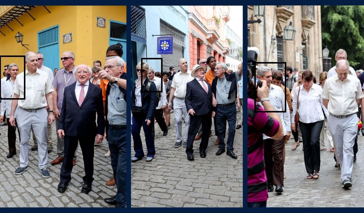 El periodista independiente también compartió reportes de prensa que nos condujeron a otras imágenes similares publicadas en una galería de la Presidencia de Irlanda, donde encontramos fotos de la visita del entonces presidente Michael D. Higgins a La Habana, en febrero de 2017. Allí se observa al coronel Roca Sánchez integrado al dispositivo de seguridad.