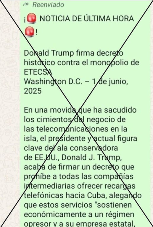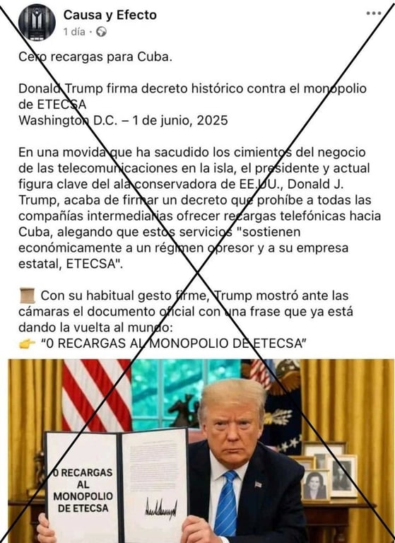 En las publicaciones, que se presentan como «Noticia de Última Hora» del primero de junio de 2025, se afirma que «en una movida que ha sacudido los cimientos del negocio de las telecomunicaciones en la isla, el presidente y actual figura clave del ala conservadora de EE. UU., Donald J. Trump, acaba de firmar un decreto que prohíbe a todas las compañías intermediarias ofrecer recargas telefónicas hacia Cuba, alegando que estos servicios “sostienen económicamente a un régimen opresor y a su empresa estatal, Etecsa”».