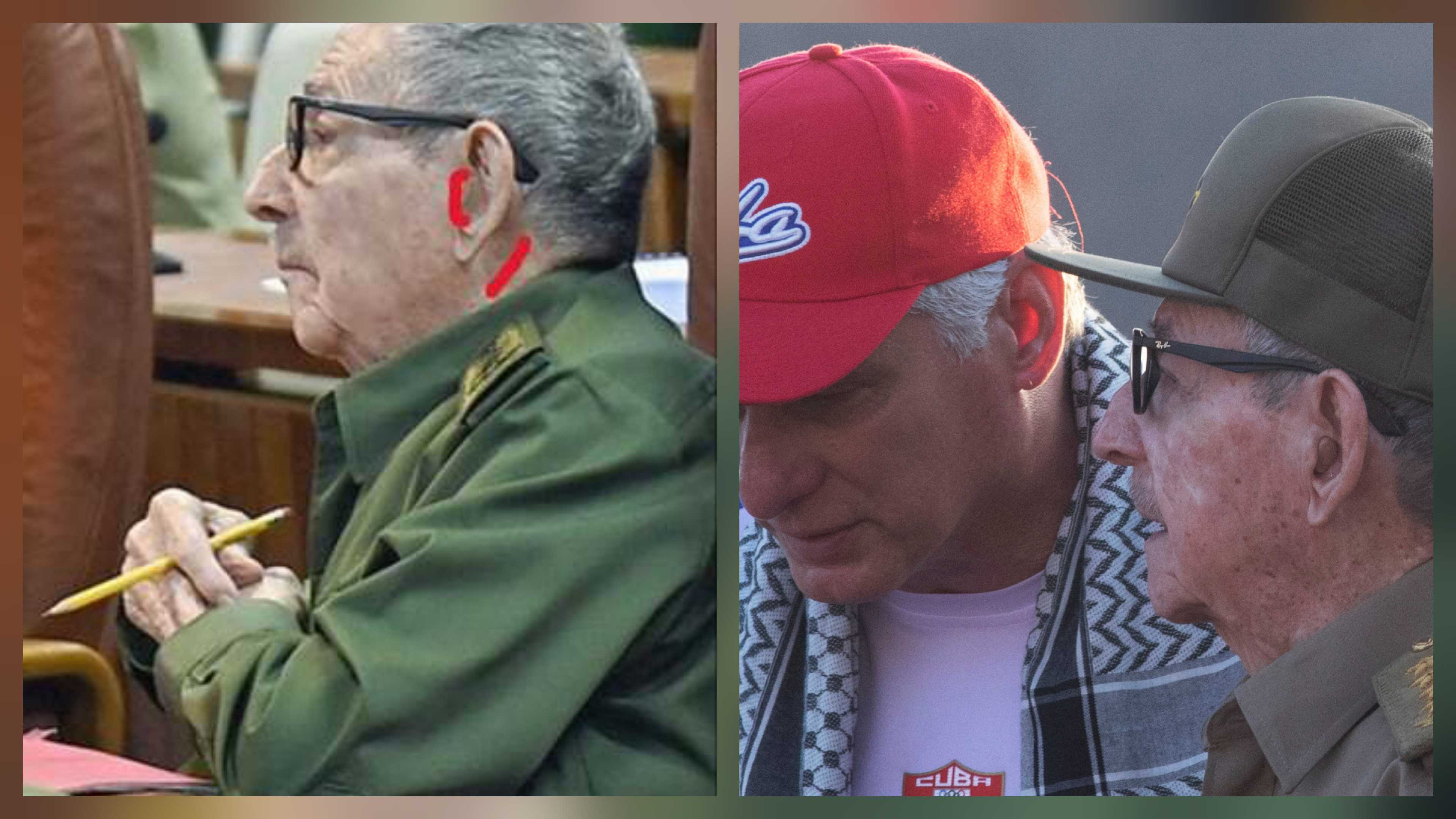 A la izquierda, imagen de Raúl Castro (2025) posiblemente editada; a la derecha, en el desfile del 1 de mayo de 2024, con el dispositivo para la audición
