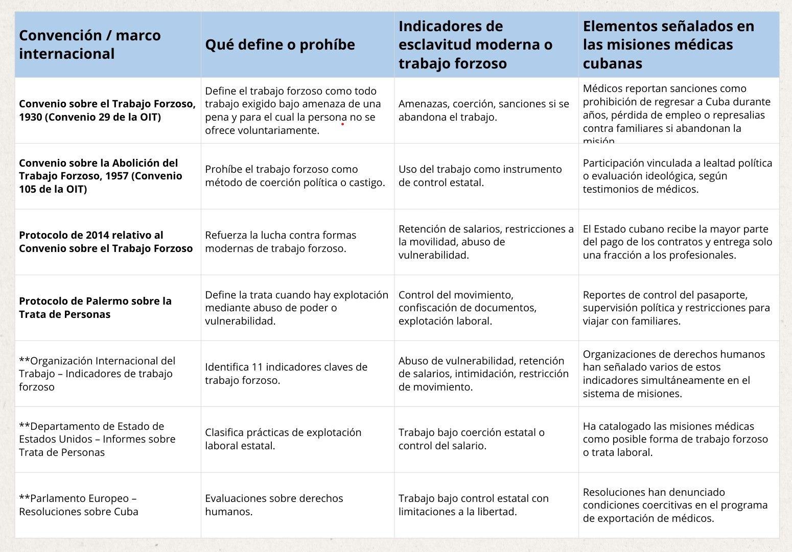 Relatores especiales de la Organización de las Naciones Unidas (ONU) sobre las formas contemporáneas de la esclavitud y la trata de personas advirtieron en un informe de 2019 que las condiciones laborales de los médicos cubanos en el extranjero «podrían constituir trabajo forzoso», criterio que fue compartido en 2021 por la Comisión Interamericana de Derechos Humanos. Human Rights Watch (HRW) también ha calificado las «misiones internacionalistas de Cuba en Salud» como un sistema con «normas draconianas» que garantiza la principal fuente de ingreso en divisas al Estado cubano y, a la vez, constituye una de las narrativas clave del márketing político de la isla.