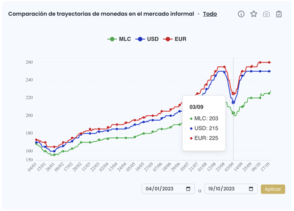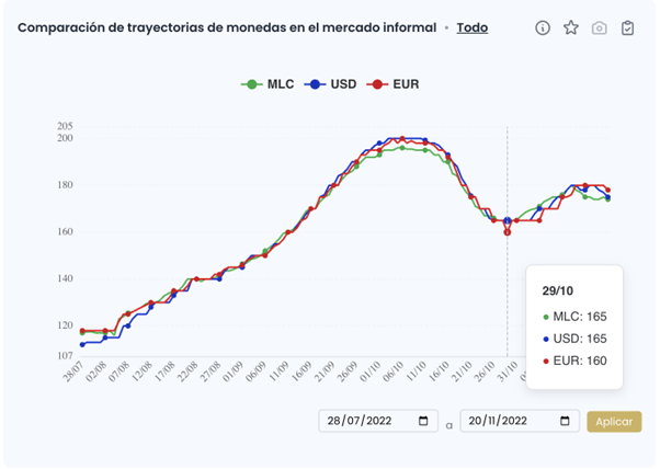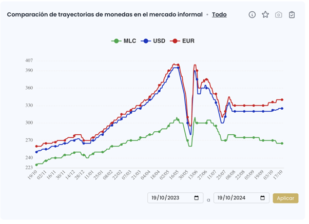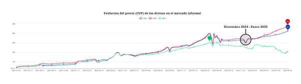 La caída en pocos días del valor del dólar de 490 CUP a valores cercanos a 420 CUP podría anticipar un nuevo overshooting: la típica corrección posterior a un período de sobrecompra; o quizá está más relacionado con dos eventos simultáneos: el paso del huracán Melissa por el oriente de Cuba y una nueva campaña de desinformación desplegada por el Partido Comunista contra la TRMI.