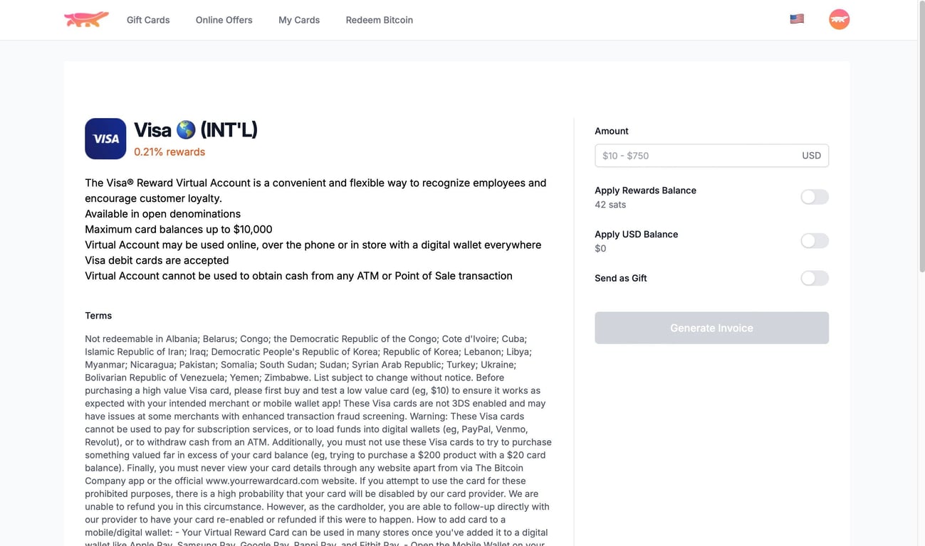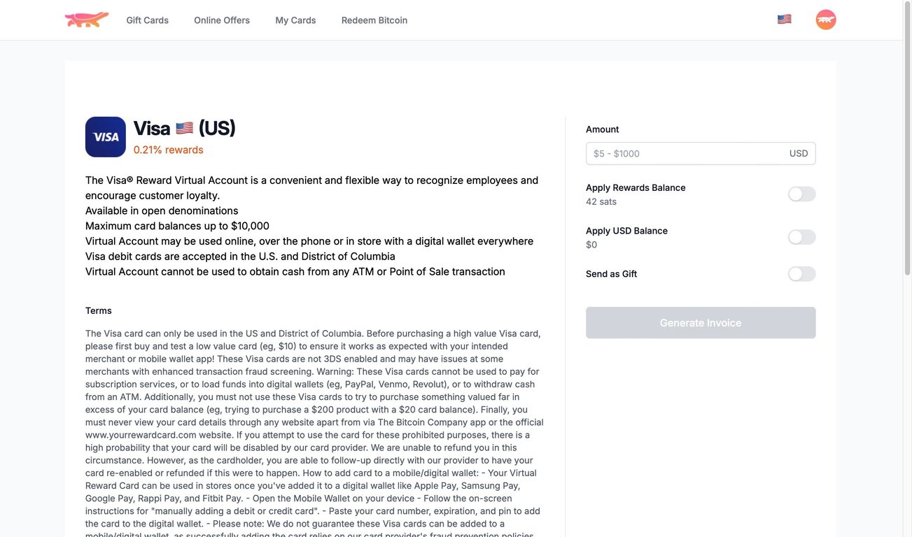 The Bitcoin Company ofrece tarjetas virtuales Visa. Las tarjetas tienen entre 5 y 1 000 USD en el caso de las disponibles para usar dentro de Estados Unidos y entre 10 y 750 USD para el resto de los países. Se pagan en bitcoin, sea por la forma tradicional (on-chain, que cobra un mayor impuesto) o por la vía más rápida (lightning, de menor impuesto). En cada compra, la compañía devuelve un pequeño porcentaje del pago inicial.