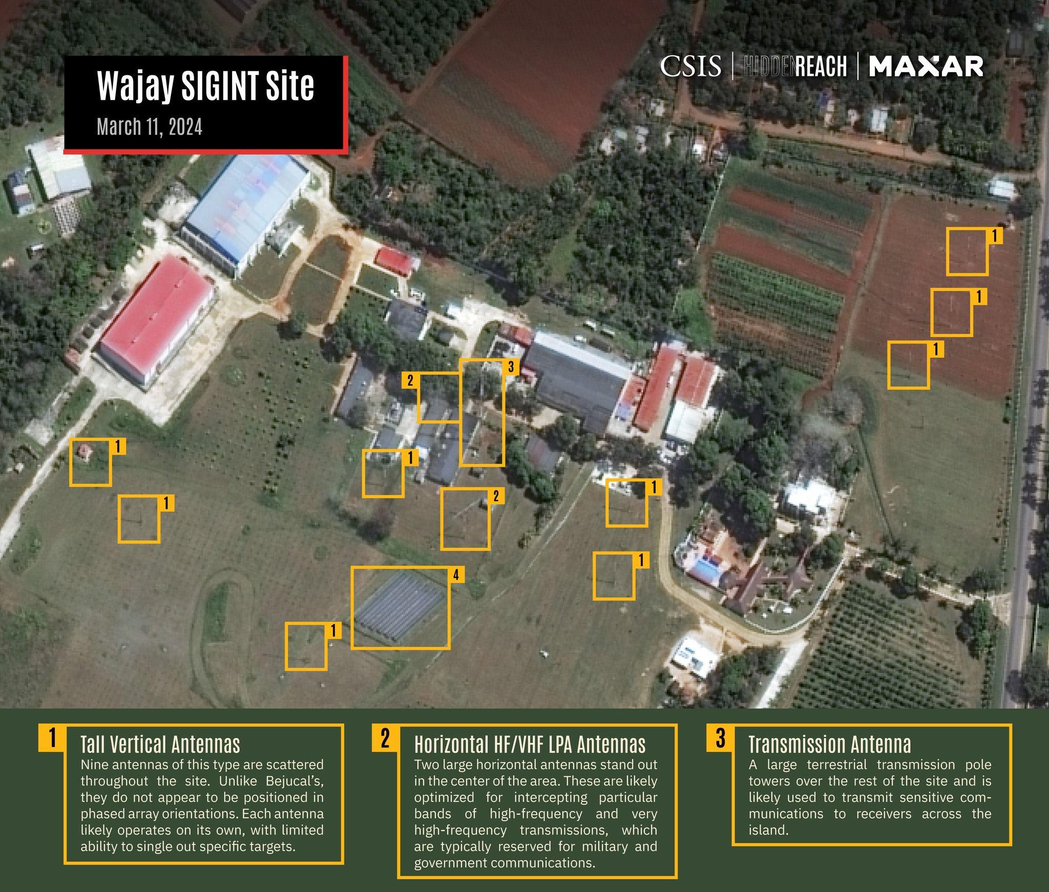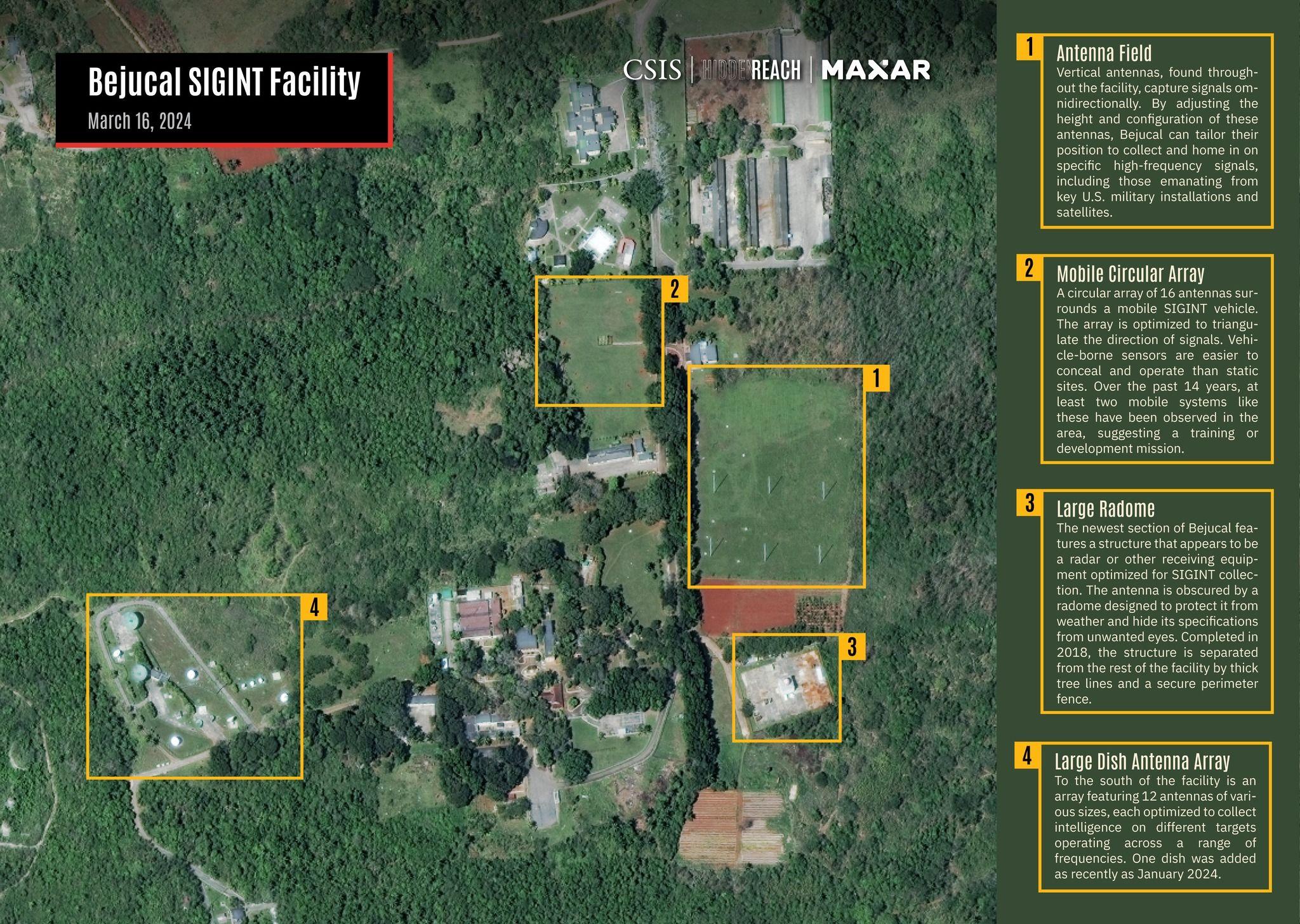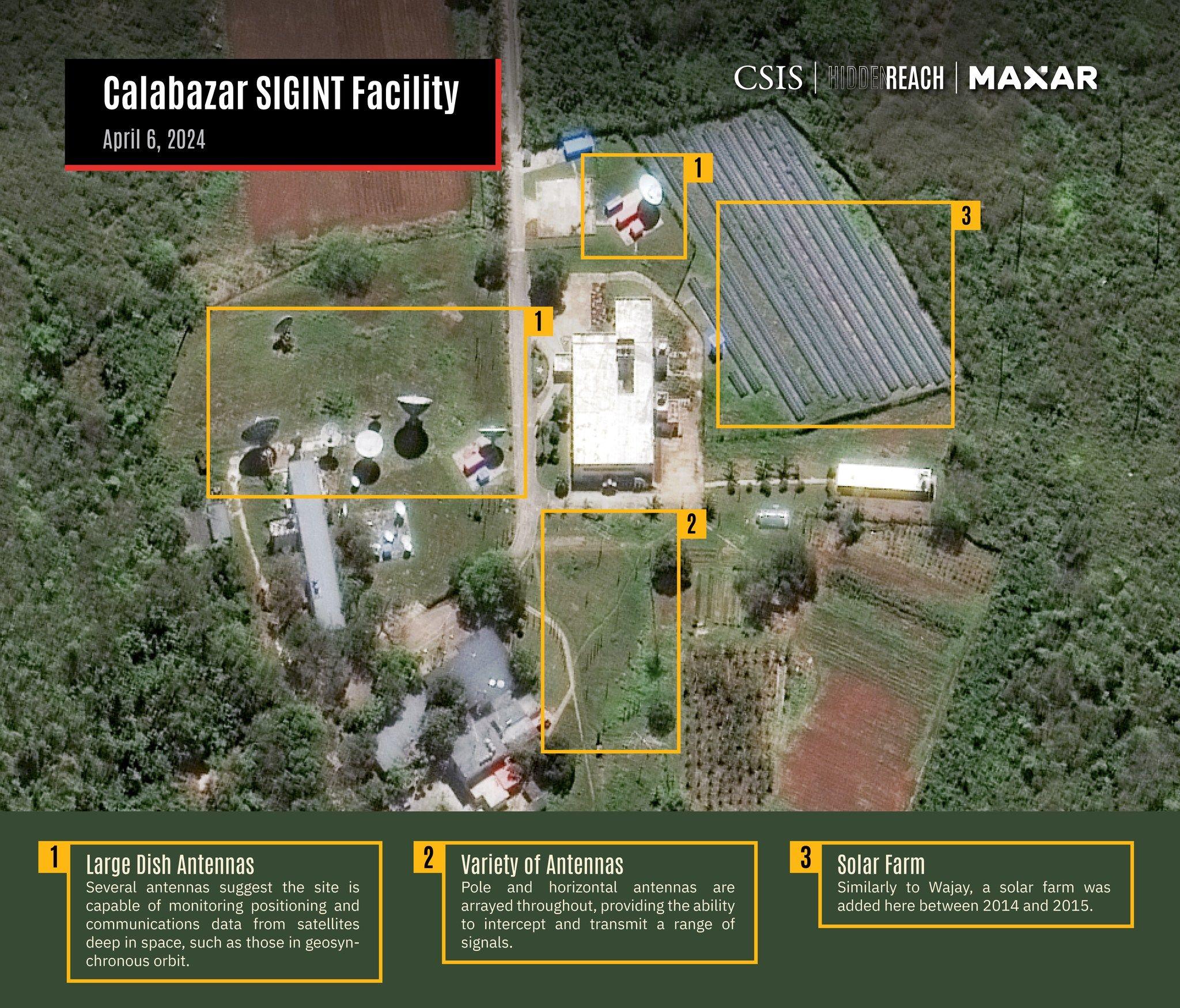 Desde 2024, varios reportes elaborados por analistas del Centro de Estudios Estratégicos e Internacionales (CSIS, por sus siglas en inglés) indican, con evidencia fotográfica y satelital incluida, que existen cuatro instalaciones de espionaje radioeléctrico y electrónico ubicadas en Cuba como parte de su colaboración militar y de seguridad con China. Las instalaciones se localizan en Bejucal, Wajay y Calabazar, en La Habana; y en El Salao, Santiago de Cuba.