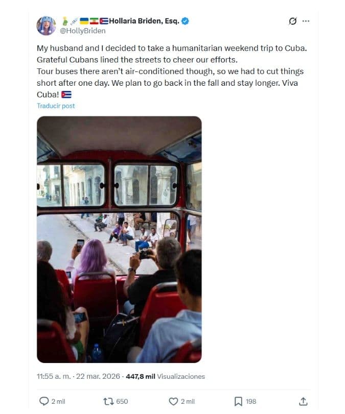 El origen de la imagen se vincula a una publicación en X de una cuenta con usuario (@HollyBriden) Hollaria Briden, quien afirmó encontrarse en la isla como parte del convoy. «Mi esposo y yo decidimos hacer un viaje humanitario de fin de semana a Cuba. Los cubanos, agradecidos, se congregaron en las calles para aplaudir nuestra iniciativa. Los autobuses turísticos allí no tienen aire acondicionado, así que tuvimos que acortar el viaje después de un día. Planeamos regresar en otoño y quedarnos más tiempo. ¡Viva Cuba!», aparece junto a la fotografía,