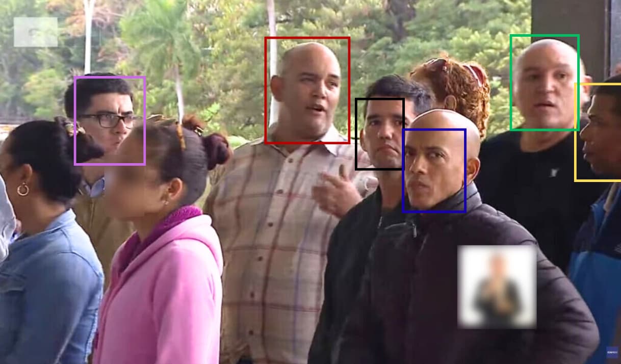 Individuos señalados como represores de la Seguridad del Estado. De izquierda a derecha: «Alberto» (cuadro violeta); «Darío» (cuadro rojo); «Hansel Guillermo», identificado por activistas como Hermes del Toro López (cuadro negro); persona no identificada por un alias, aunque sí fue reconocido por varias víctimas (cuadro azul); Rafael Pupo, alias «Juan Carlos» (cuadro verde); «René» (cuadro amarillo). Foto: captura de pantalla del Canal Caribe