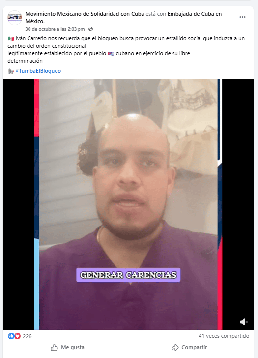 Su nombre es Iván Carreño. Según su perfil de Facebook, parece ser profesional de la Salud, es militante del Partido Comunista de México (1, 2, 3, 4) y está vinculado con el Movimiento Mexicano de Solidaridad con Cuba, una organización política asociado con la Embajada cubana en ese país.