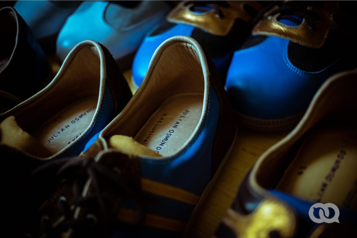 La sala de Julián es taller y almacén a la vez. Un espacio repleto de modelos de zapatos, máquinas de coser, plantillas, hilos y telas. Hay colores por todas partes y la luz de las lámparas está estratégicamente dirigida a la mesa sobre la que une las partes de lo que será el calzado tatuado con su nombre. Su último ejemplar es una innovación: un zapato muy difícil de realizar, «muy complejo», que garantiza máxima comodidad a quienes lo usen. Lo bautizó «el Rolex de los zapatos artesanales». Con plantillas que te dan la sensación de caminar sobre nubes de algodón.