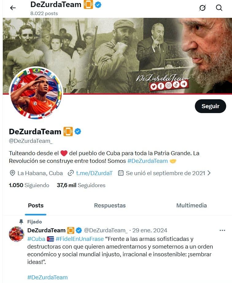 Entre los perfiles analizados se encuentra @DeZurdaTeam, que supera los 37 600 seguidores y declara haber sido creado en La Habana, Cuba. La cuenta tiene verificación activa en X, un servicio que actualmente está vinculado a una suscripción de pago y requiere acceso a sistemas financieros internacionales. En el contexto cubano, donde las transacciones electrónicas hacia plataformas extranjeras enfrentan restricciones, este elemento resulta llamativo.