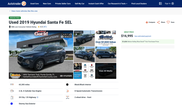 Para tener una idea de los precios que se manejan en los sitios bastaría con tomar de muestra la plataforma Autotrader que el 13 de abril de 2024 tenía disponibles autos Hyundai, modelo Santa Fe (los que comercializa Katapulk en su tienda), fabricados entre 2019 y 2021 con precios que oscilaban entre 17 000 USD y 25 000 USD.