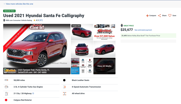Al comparar los precios que ofrece Katapulk con los del sitio independiente de comercialización Autotrader, se puede calcular un costo promedio en EE. UU. para un Hyundai Santa Fe fabricado después de 2018. El ejercicio sugiere que el valor medio de un vehículo de este tipo es de 26 000 USD.