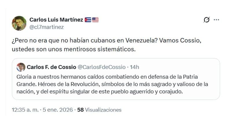 En diciembre de 2024, el viceministro de Relaciones Exteriores, Carlos Fernández de Cossío, para evadir las reiteradas denuncias sobre militares de Cuba operando con el régimen de Nicolás Maduro, también negó la presencia de «soldados» cubanos en Venezuela.
