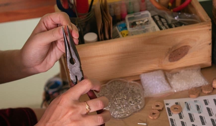 Apoyada en una mesita de madera de un metro por un metro, Sandra Milián usa una pequeña fresadora eléctrica para pulir un fragmento circular de corcho. Frente a ella, su hermana mayor, Claudia, agarra un pinchito metálico entre las muelas de una pinza y le abre un pequeño agujero a otra pieza de corcho, pasa una argolla metálica, la sella. El papel que usan como mantel para no dañar la mesa está lleno de polvo carmelita. Lo sostiene una cesta de mimbre rellena de corchos.
