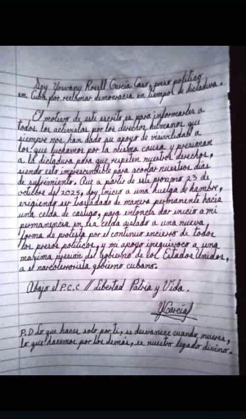 Mailín Rodríguez conoció que su esposo, Yosvany Rosell García, se declararía en huelga de hambre a través de una carta que le envió desde la Prisión Cuba Sí (Holguín). En el manuscrito, el joven condenado a 15 años por el 11J anunció que protestaría «por el continuo encierro de todos los presos políticos» y para apoyar la «máxima presión» del Gobierno de EE. UU. contra el régimen cubano.