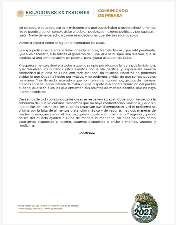 Expresó su solidaridad con el pueblo de Cuba e invitó a una búsqueda de soluciones «mediante el diálogo, sin el uso de la fuerza, sin la confrontación, sin la violencia». Pero al ser interpelado en específico sobre la orden de combate hacia los cubanos que se manifestaban en las calles, lanzada en televisión nacional por el presidente Miguel Díaz Canel, AMLO se limitó a expresar: «Eso es un asunto de política interna de Cuba. Yo lo que deseo, y lo digo con sinceridad, es que no haya confrontación, no haya violencia y que, sin injerencias del extranjero, los cubanos resuelvan sus discrepancias».
