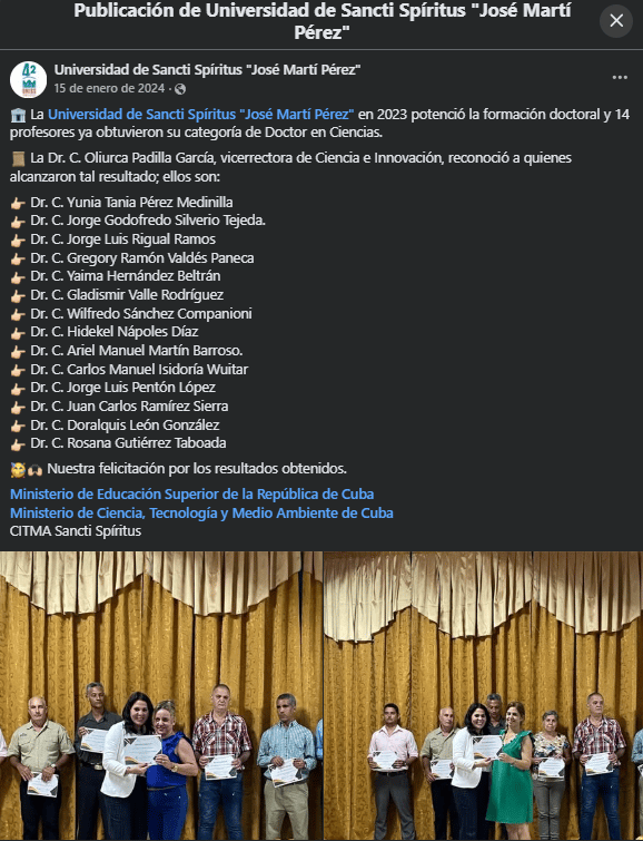 La Uniss felicitó el 15 de enero de 2024, en el Facebook oficial del centro de altos estudios, a Ariel Manuel Martín Barroso (entre otros profesores) por obtener la categoría de doctor en Ciencias. Ariel Manuel Martín también era miembro de la Junta de Acreditación Nacional (JAN) del Ministerio de Educación Superior (MES).