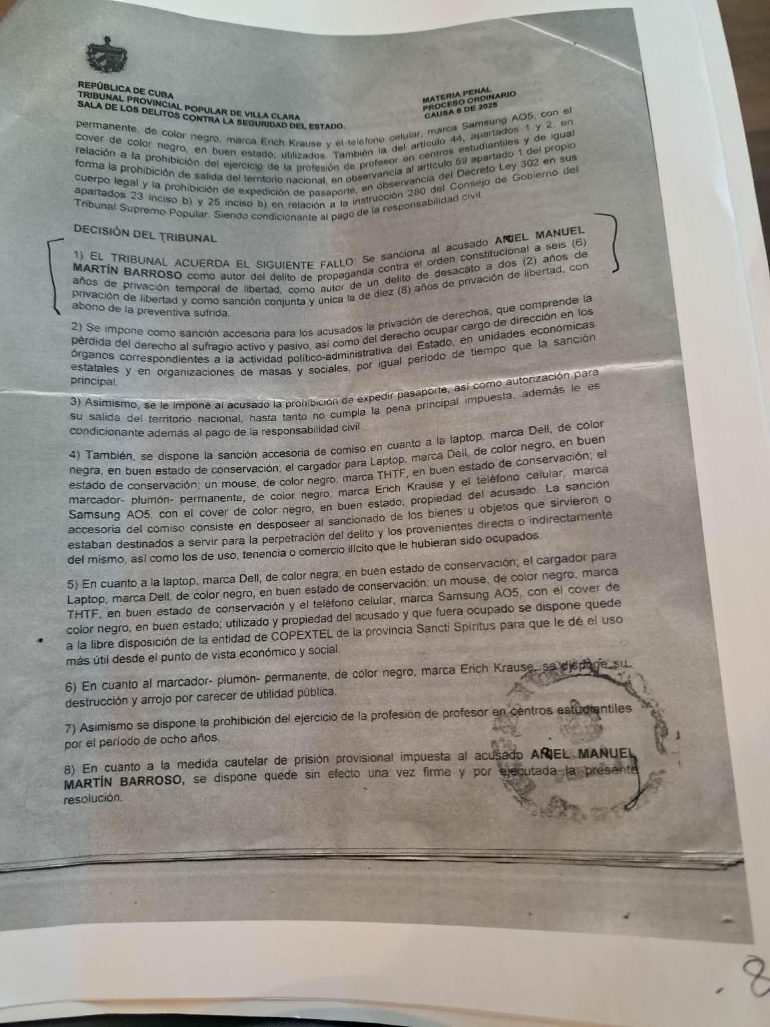 De acuerdo con la sentencia número 11 de 2025 del Tribunal Provincial Popular de Villa Clara, a la que tuvo acceso elTOQUE, los cargos utilizados para condenar a Martín Barroso fueron «propaganda contra el orden constitucional» y «desacato», en un proceso en el que se le acusó de escribir letreros antigubernamentales en paredes de la universidad espirituana y otros lugares de la ciudad, en varios momentos entre 2024 e inicios de 2025.