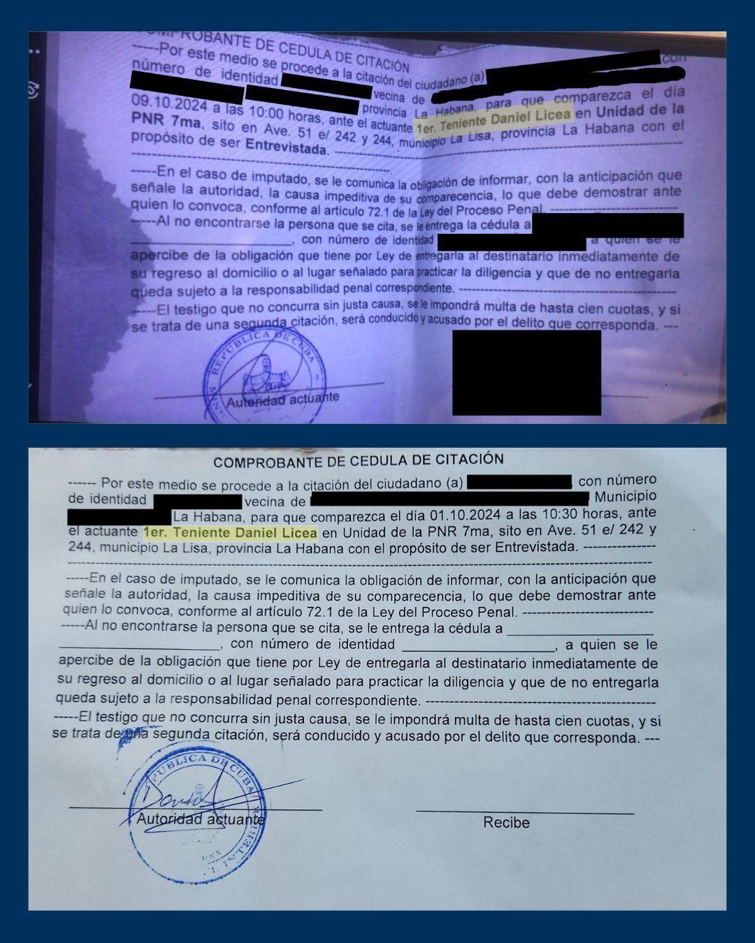 Citaciones policiales para interrogatorios arbitrarios ordenados por Daniel Licea. Fotos: tomadas del Facebook de Yennys Hernández.