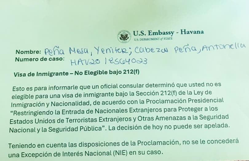 El resultado es que muchas familias cubanas han acudido a su entrevista consular después de ocho o diez años de espera, han completado los pasos del proceso y al final reciben una notificación informando que la visa no puede ser emitida debido a la proclama presidencial. No se trata de fallas en los documentos ni de errores en el trámite: es una suspensión automática basada únicamente en la categoría migratoria del caso.
