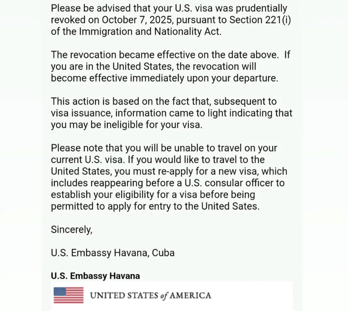 La Embajada de Estados Unidos en La Habana revocó la visa vigente que poseía un ciudadano cubano para ingresar a territorio estadounidense por considerarlo no elegible para mantenerla luego de que los funcionarios consulares recibieran nuevos datos sobre él.