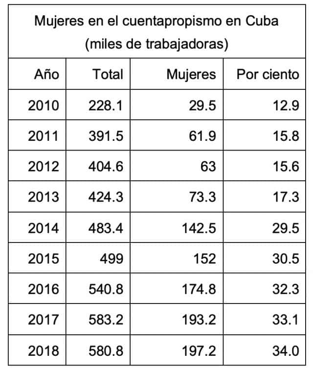 Sin embargo, las mujeres cubanas representan apenas el 33,9%, del total de los TCP. Aunque la proporción de ellas respecto al total de cuentapropistas aumenta cada año, esa cifra nunca ha estado por encima del 35%.